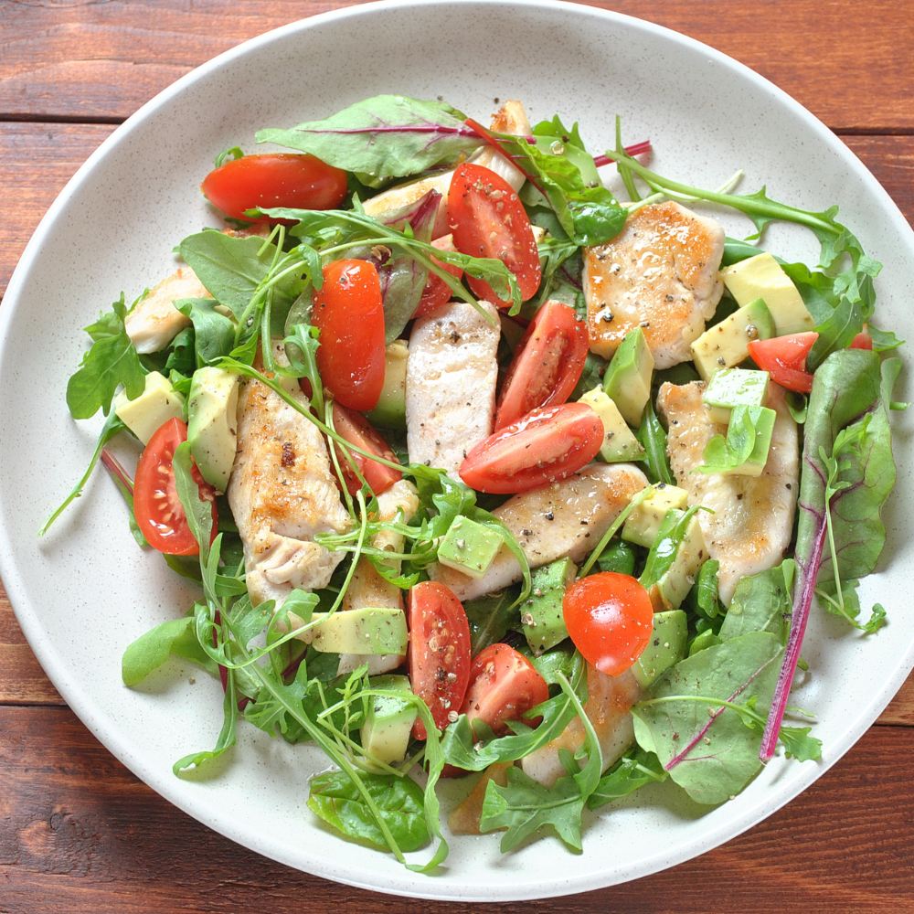 Salade avec laitues, poulet, oignons, tomates, poivrons verts, olives, vinaigre, huile d’olive.